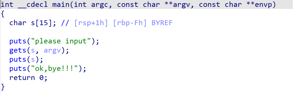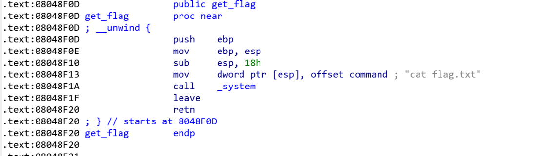 get函数不会限制输入的字节数,于是我们想到栈溢出,用栈溢出来覆盖我们发现的system("/bin/sh")的地址。