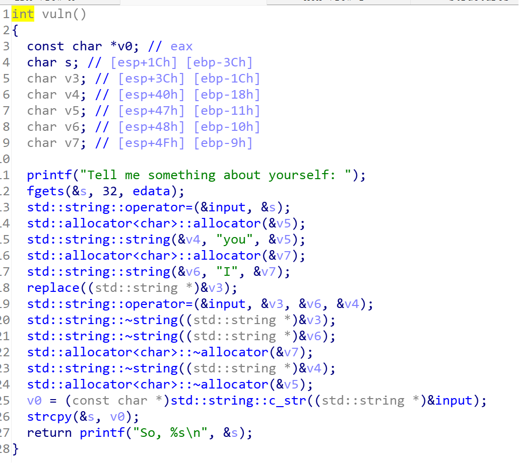 replace函数将”I”替换为”you”(从1字节变为3字节),通过字符逃逸实现栈溢出。fgets有限制输入字节数,但通过字符替换可以增加字节数目。