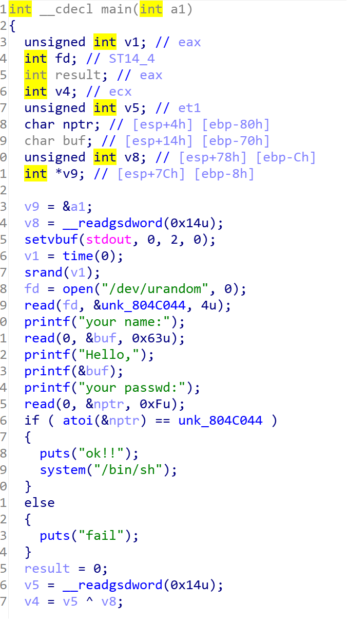 发现它先生成一个随机数(4字节),如果输入与随机数相同,即可获得flag。可以发现read可以栈溢出,可以通过栈溢出改变随机数从而通过if函数,这就要绕过canary保护。
