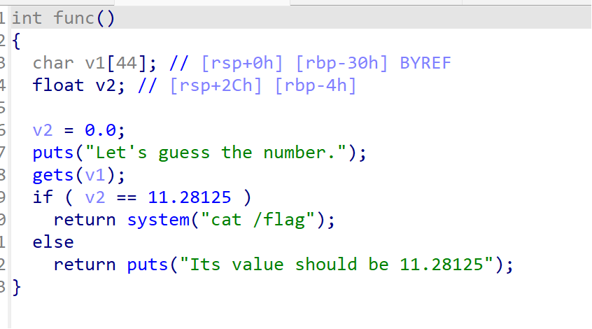 发现它先让v2=0.0,有一个条件判断,我们只要让v2=11.28125即可执行cat flag获得flag。于是我们想到栈溢出,栈溢出不仅可以覆盖地址,还可以覆盖变量值,我们可以通过栈溢出覆盖v2,使其变为11.28125即可获得flag。
